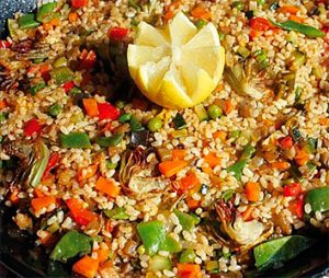 - Paella vegetariana: Esta es una opción para aquellos que prefieren una dieta vegetariana. Se prepara con arroz, verduras como pimientos, alcachofas, tomates, guisantes y judías verdes, y especias como ajo, azafrán y pimentón. Se cocina todo junto en una sartén de hierro hasta que el arroz esté tierno y se forme una capa dorada y crujiente en la parte inferior.
